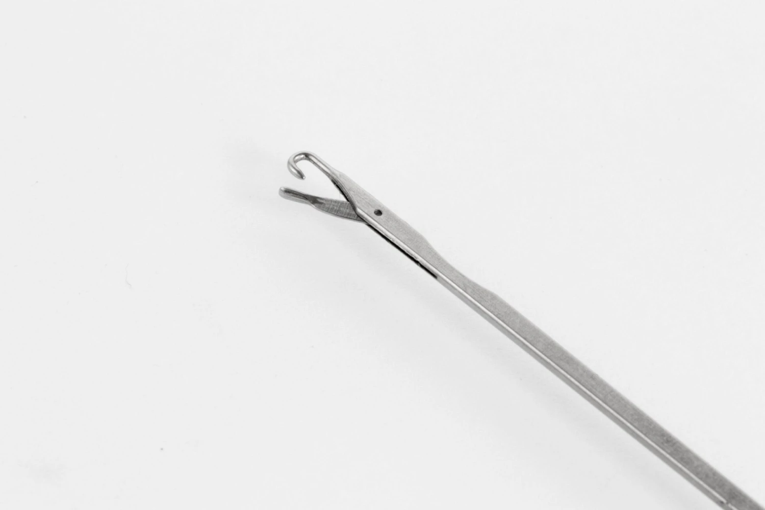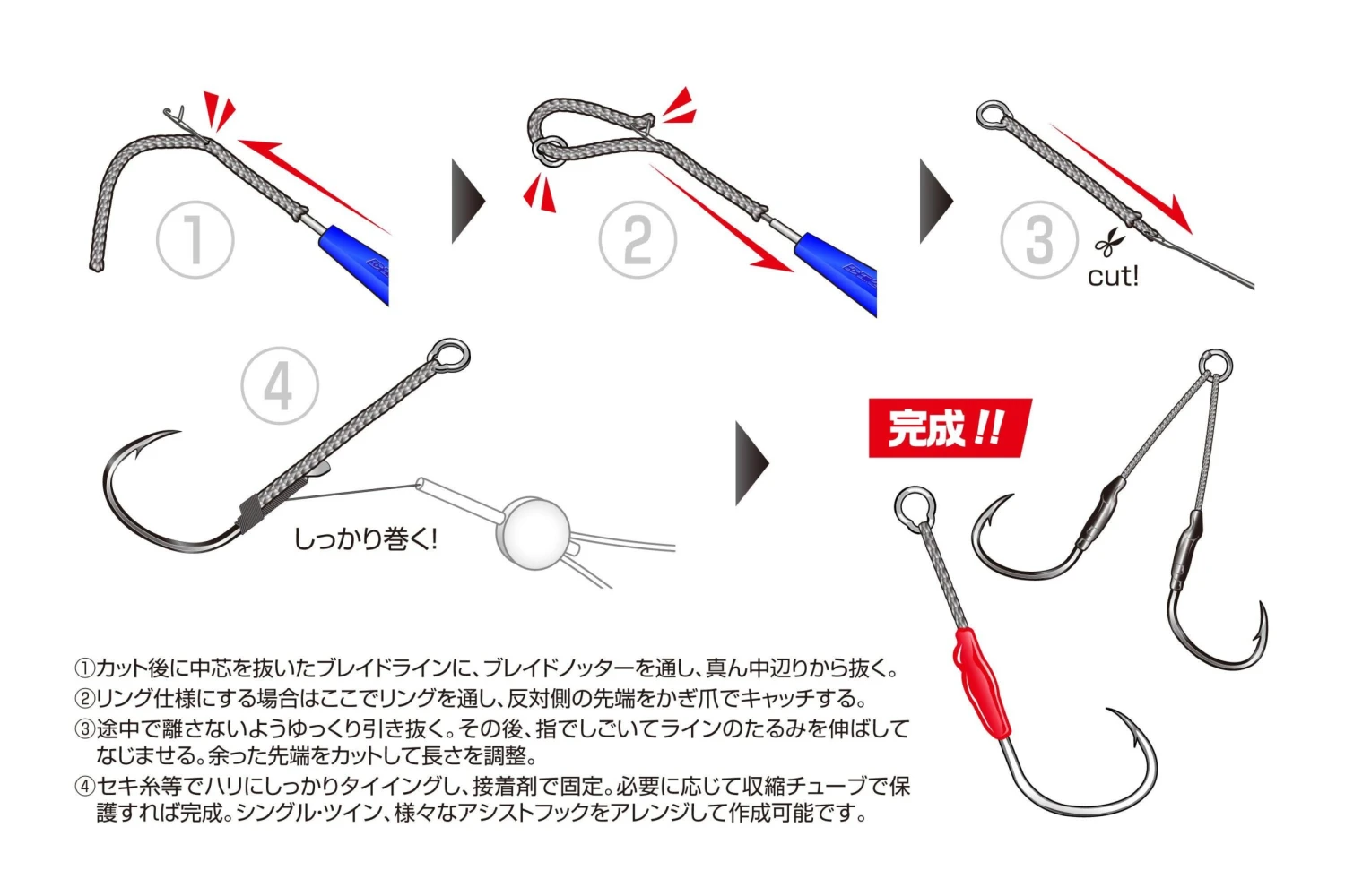It is a needle tool that streamlines the work of removing the core and inserting the braid line for jigging. Ideal for self-made assist hooks using loop eyes and solid rings. In addition, it is also useful for supporting knots such as figure 8 knots, and for rigging octopus baits and hollow frogs.