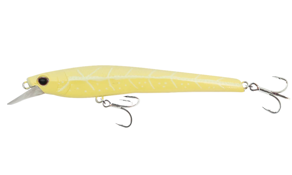 The SHIKARI is a long-casting, shallow diving, slow floating jerkbait with an internal tungsten weight transfer system. The internal weight slides backward into the tail when casting to maximize distance, and then rolls forward when being retrieved to balance the lure and keep it perfectly level.