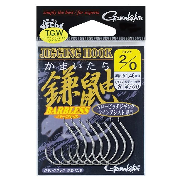 It is a jigging hook with an ultra-short axis wide gap that can be hung with a fall bite. The “lightweight thin shaft” design made possible by the high toughness material “TGW” does not impair the delicate and natural slow pitch action. Barbless that does not widen the wound with high penetration and a weak point press that leaves a round shaft on the bend heel pursues zero shortage to the utmost limit. In addition, since it is an ultra-short axis, the hooks do not easily interfere with each other, and hooks can be set easily before and after the short jig. It can be widely used for root fish such as scorpion fish and groupers in the nearby sea and hairtail jigging.