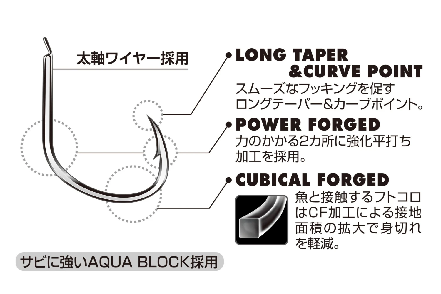 With a light tackle and a lightweight jig, it is a small jigging hook that supports high dimensions for micro jigging aiming at various targets. CF (Cubical Forged) processing is used to increase strength and reduce shortage so that the action of the light jig is not impaired and the prey is caught firmly. It also demonstrates the high potential of Pike as an assist hook for sea bream mules.
