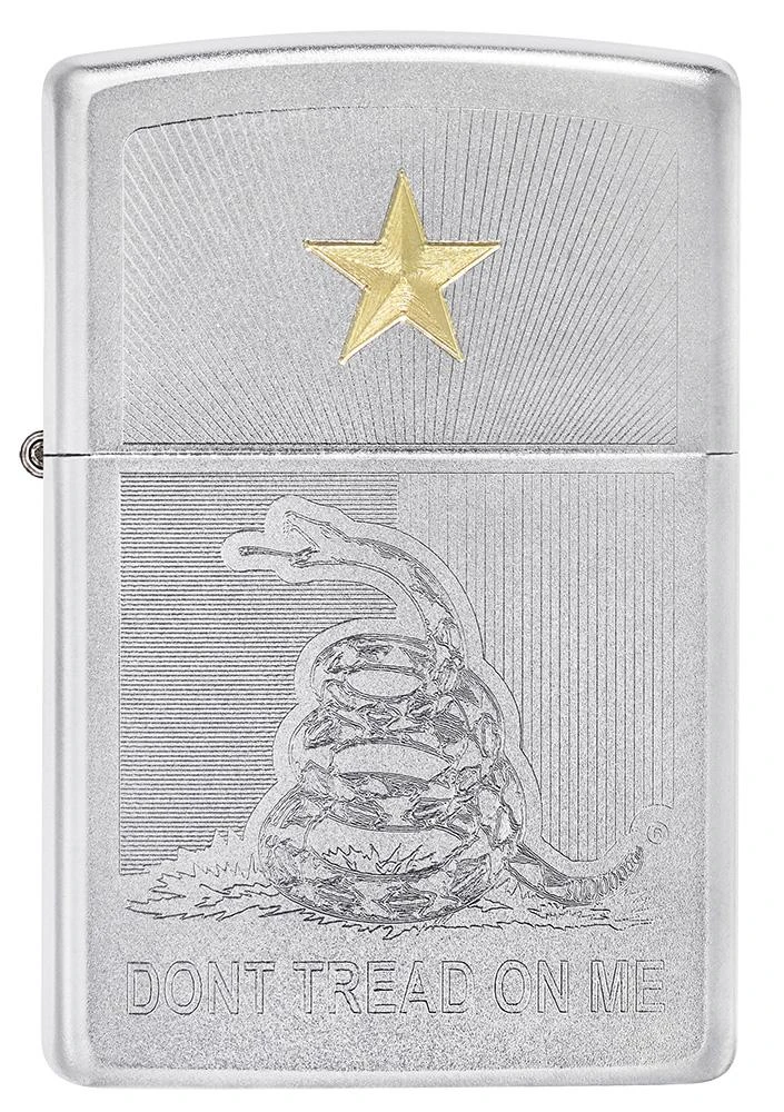 Since 1887, “Dont Tread on Me®” and the Gadsden Flag has been a symbol of American Independence and determination. This design uses the Laser Two-Tone process to create the iconic Gadsden Flag on this Satin Chrome lighter. Two different depths are achieved by utilizing the laser two-tone process, which is evident when looking between the coiled snake above the “Dont Tread on Me®” expression and the star on the lid. Comes packaged in a gift box. For optimal performance fill with Zippo lighter fuel.
