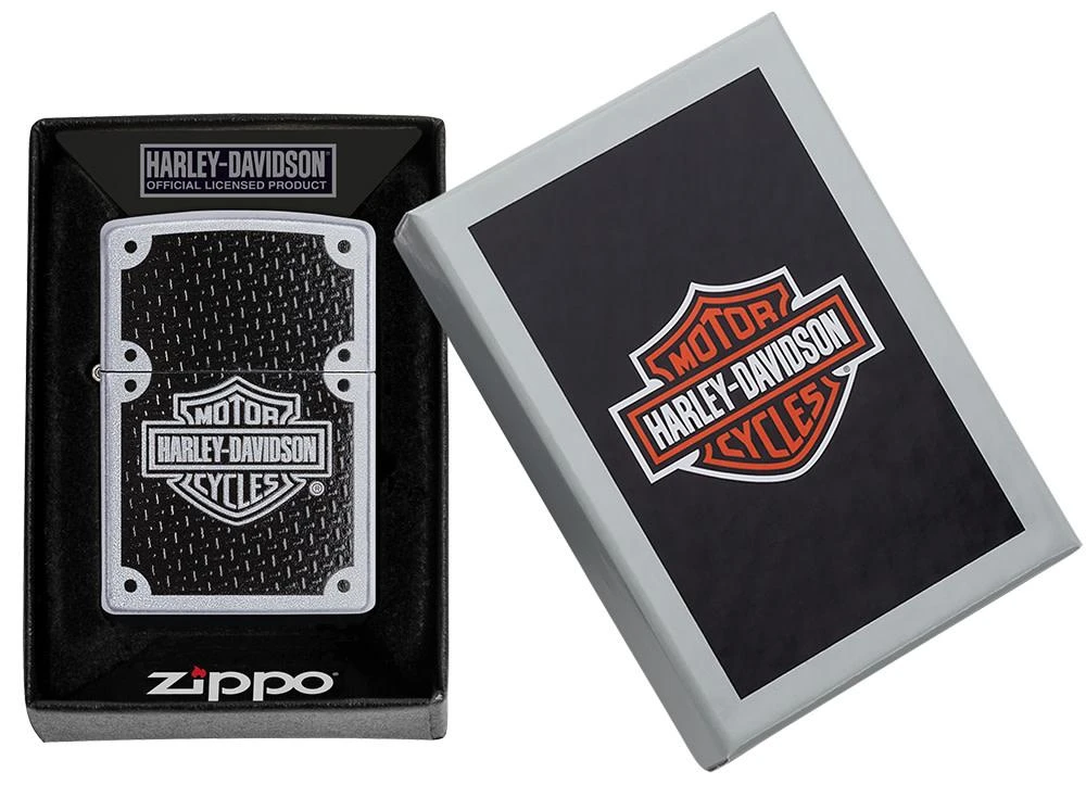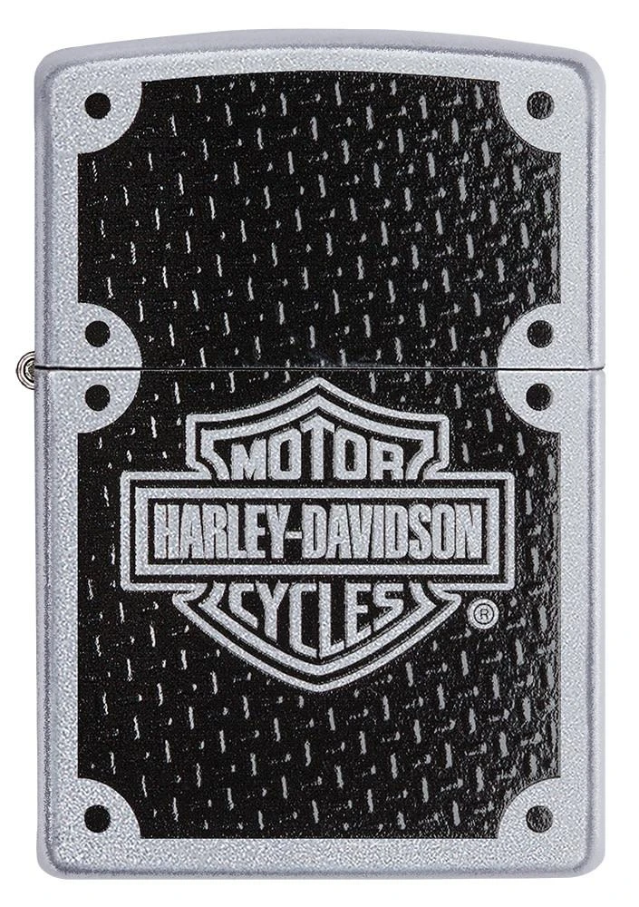 This Satin Chrome lighter features the Harley-Davidson® bar and shield logo woven into a carbon fiber background. Comes packaged in a gift box. For optimal performance, fill with Zippo Lighter fuel