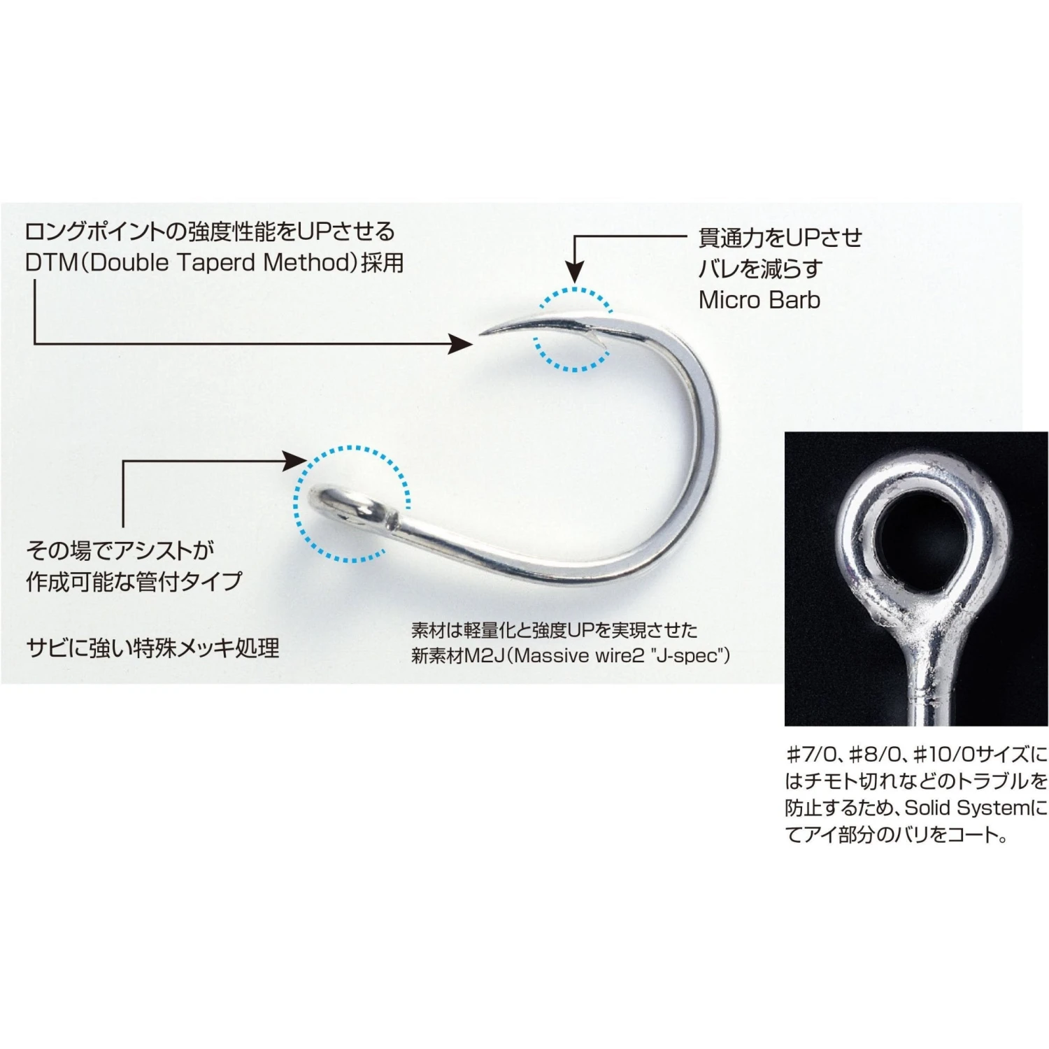 Hook with tube for assist only. Targeting a wide range of game fish from the bottom to the middle class, it is also possible to create assist hooks along with the jig on board. A new basic that emphasizes outstanding hooking response and durability. From # 1 to # 6/0, the material adopts M2J, which has good compatibility with high elasticity rods, and DTM processing is applied to the points to maintain hooking response. For # 7/0, # 8/0, and # 10/0, M1J, which is compatible with low-elasticity rods, is used. The Bite portion from the point to the flute is long to prevent burring. Even in the eyes, burrs are coated with the Solid System to prevent troubles of Chimoto and finished smoothly.